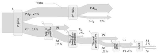 Sankey chart of the full protein extraction process, including all additional steps, with values for mangold as an example. Percentages shown indicate nitrogen flow through the process steps 1–6 (% of initial biomass nitrogen). GJ: green juice, S: supernatant, P: pellet, sp: second press, fp: freeze precipitate.
