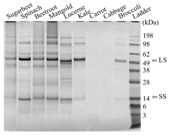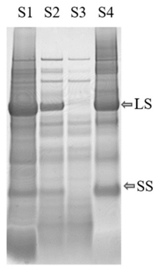 Results of SDS-PAGE analysis of freeze-dried white protein isolates (S4, see Figure 2) dissolved in water. The RuBisCO subunits are at ~55 kDa and ~14 kDa. LS: large subunit, SS: small subunit.
