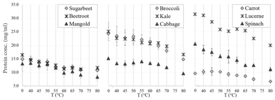 There were differences in thermal coagulation behavior of GJ from the different green biomass types, as indicated by the optimal temperature for precipitating the green proteins while simultaneously keeping the white protein in the WJ (Figure 5). The RuBisCO subunits (around 55 kDa and 14 kDa) and most other proteins in all biomass types were generally unaffected by heating for 25 min at temperatures of up to 50 °C, while protein bands started to disappear (precipitate together with the green proteins) at 50–55 °C and disappeared (precipitated fully) at 60–65 °C (Figure 5 and Figure 6). The reason for the weak reappearance of the RuBisCO large subunit at 80 °C for some biomass types (e.g., broccoli and sugarbeet; Figure 6) is unclear but could possibly be a result of the two subunits dissociating at higher temperature, and a difference in the solubility of the two subunits at these temperatures. The clearest difference between the biomass types with regard to precipitation temperature of RuBisCO was the upper temperature for full precipitation. RuBisCO was still present to some extent at 55 °C in all biomass types evaluated (Figure 5, Supplementary Figure S1), but at 65 °C RuBisCO was still only clearly present in the spinach sample. Similarities in response to thermal treatment (e.g., changes in protein composition and concentration) were seen for crops of the same family, e.g., the three varieties of Beta vulgaris (sugarbeet, beetroot, and mangold) and the two successfully extracted Brassica species (broccoli and kale). The Beta vulgaris varieties showed relatively low protein thermal stability, with a clear drop in protein concentration at 55 °C (Figure 5) and a noticeable decrease in the intensity of the RuBisCO bands at temperatures above 50 °C (Supplementary Figure S1). A similar concentration drop at 55 °C was observed for kale and broccoli (Figure 5), but the band intensity was intact at temperatures up to 55 °C (Supplementary Figure S1), indicating greater thermal stability of RuBisCO in Brassica biomass. Previous studies have determined the denaturation temperature of RuBisCO from lucerne to be between 61.85 °C and 66.85 °C, depending on the environment [39], and that of RuBisCO from spinach to be 64.9 °C [20]. Thus, differences in denaturation and precipitation of RuBisCO in the biomass types examined in this study might be explained by the environment of the protein, with the S1 matrix affecting the stability and thermosensitivity of RuBisCO and other proteins present. For successful thermal protein precipitation, the optimal temperature may have to be determined for each biomass type to be used in an industrial process.