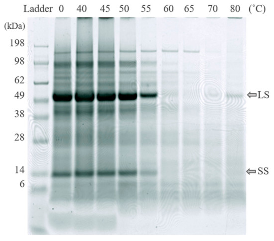 Effects of thermal treatment temperature on protein composition (analyzed using SDS-PAGE) in particle-free supernatant (fraction S1) from sugarbeet biomass. LS: large subunit, SS: small subunit of RuBisCO.