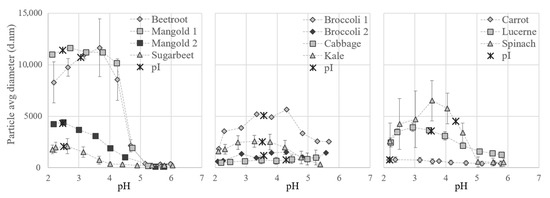 Particle size measurements and pI determinations confirmed that proteins from the different biomass types responded differently to variations in pH (Figure 7). Differences were even seen between varieties, e.g., the particle size of beetroot aggregates increased drastically at pH 4.5 and those of sugarbeet at pH 3.5. Data on pI values and on solubility of the full S2 fraction have not been reported previously, but the pH for minimum solubility of the final white protein concentrates has been reported to be e.g., 3.5 for soy bean leaves [40], 4 for spinach [31], and 5 for sugarbeet [11].
