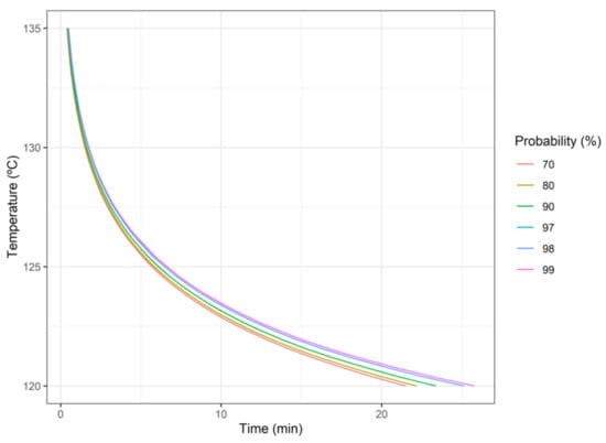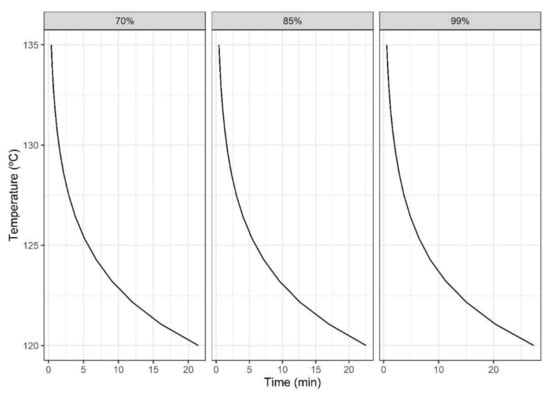 To complement these design steps, the duration of treatment should be calculated. For that purpose, Figure 8 shows the time (x-axis) for each temperature (y-axis) for three selected probability values of . Therefore, in the example, if the required temperature is 130 °C for a level of 85%, in the middle plot a treatment duration of 2.5 min is obtained. This value can be more easily retrieved by simulating both models (acrylamide production and microbial inactivation).