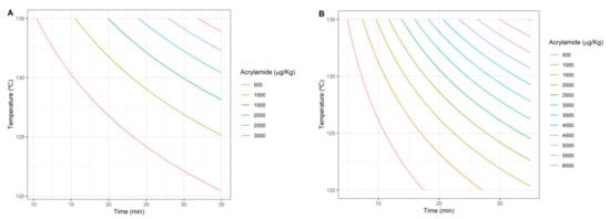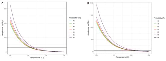 In Figure 7A, for pureed potato, the horizontal line divides the desirable region at around 126–127 °C for all the considered probabilities. Therefore, the heat treatments should be above that temperature. At 126–127 °C we would lie within the recommended limit of acrylamide (25–30 μg/kg) whereas an increase of 8–9 °C would produce around 1 μg/kg (Table 2). For the case of prune juice, Figure 7B, the same behaviour is observed. However, the amount of acrylamide formed is higher, as the initial concentrations of fructose and asparagine are also higher. In this case, the recommended limit for all the considered probabilities would lie within 129–130 °C. This information can be useful to consider the use of these foods in, e.g., baby-food products, to avoid exceeding the recommendation.