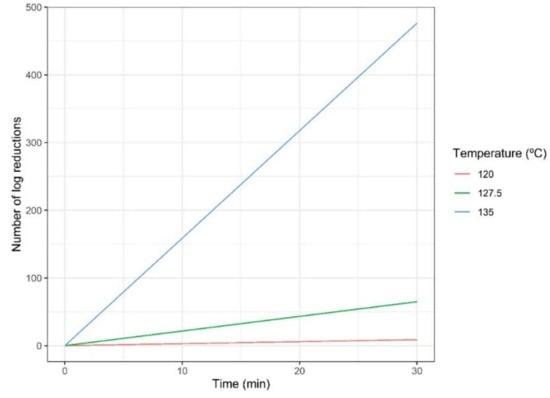 As Geobacillus stearothermophilus spores are used to validate heat sterilization processes [31,32,33,34], this study evaluates the inactivation of this microorganism in a heat treatment within the typical temperatures applied to the studied products (120–135 °C).