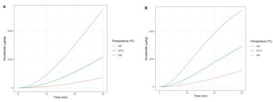 It is observed that both for the potato puree (Figure 5A) and the prune juice (Figure 5B), the lower the temperature, the greater the amount of acrylamide is formed due to the higher treatment time needed to achieve . As the temperature increases, the treatment time required to inactivate the spores decreases, and therefore the amount of acrylamide formed is also lower. We must recall that both objectives (i.e., microbial inactivation and acrylamide formation) are determined by the combination of temperature and time. The processing time for each temperature is determined by the defined level of inactivation (i.e., ). This time is different for each temperature and the balance between dynamics explains the unexpected differences in the calculated acrylamide amount.