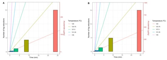Figure 5A,B represent the inactivation curves for five different temperatures between 120 and 135 °C and the acrylamide formed for each temperature when for pureed potato and prune juice, respectively. Inactivation curves are represented as coloured lines and the left y-axis measures the number of logarithmic reductions. As discussed before, higher temperatures result in a higher slope of the inactivation rate. Bars placed at the times required for each treatment temperature show that processes at higher temperatures need less treatment time to achieve at least six log-reductions with a 95% probability. On the other hand, the height of each bar represents the acrylamide formed for each treatment (time–temperature).