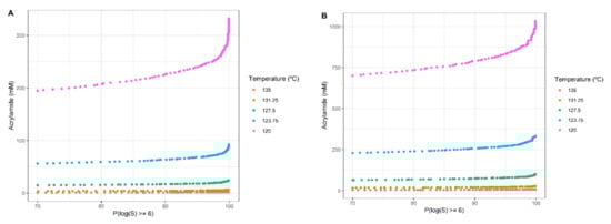 The highest temperature tested (135 °C, orange dots) caused the lowest amount of formed acrylamide at any level of probability as treatment time was short. On the other hand, for the lowest temperature (associated with long treatment times, 120 °C, purple dots) the highest amount of acrylamide is formed. This reaffirms the results obtained in the previous section and also allows us to broaden the perspective of the problem, as it can be observed that increasing the probability of reaching the target microbial inactivation promotes the acrylamide formation, although with a very low sensitivity, except in the area of probability close to 100%, where the acrylamide formation tends to rise more significantly. The differences between foods (Figure 6A,B) are only manifested in the acrylamide levels, but the qualitative behaviour is similar.