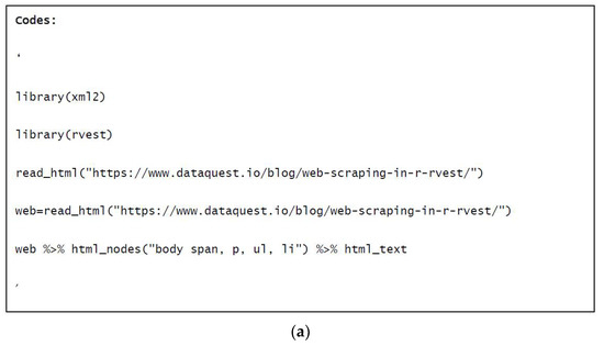 The first step was to load the packages which supported the web scraping. In this case, xml2 (R code) and rvest were loaded in the first and second lines, respectively. By applying the “read_html()” command and typing the URL into the brackets, this page’s source file was captured in the third line. After this, the Cascading Style Sheets (CSS) information (in the .html document) was used to locate the text, which was needed to be scraped from the page. Normally, these elements of the website could be reached by opening the developing tool in the browser. Finally, by typing the CSS information into the brackets in the “html_nodes()” command, all of the text from this webpage was scraped and illustrated in the R console. An example of the scraped information is showed in Figure 1b.