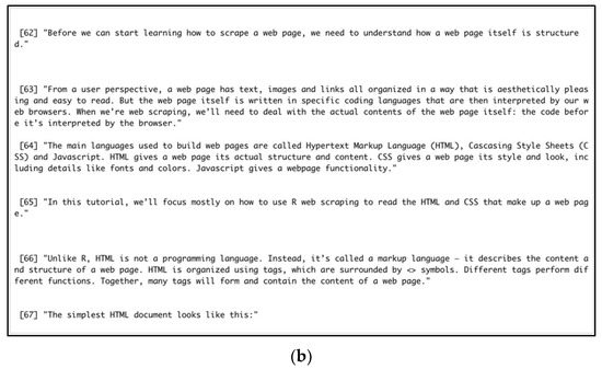 Code (a) and a part of the text captured from the website (b) by the crawler.