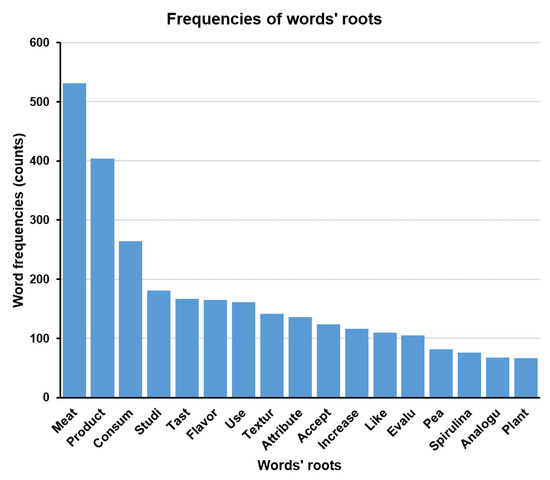 A high frequency of “meat”, “protein”, “product”, “food”, and “consum” root words (531, 432, 404, 356, and 264, respectively) was observed.