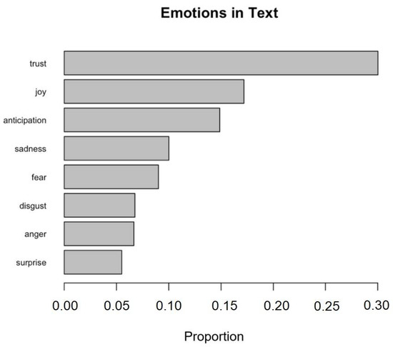 “Trust” dominated the sentiments in the text matrix with an observed occurrence of 30% (Figure 5). However, “trust” cannot be classified as either positive or negative as this proportion is showing the cumulative occurrence for all contexts. “Joy” had the second-highest proportion in the text matrix, which might indicate that researchers or consumers felt optimistic for the future of the alternative proteins. In previous research, consumers have well accepted plant-based proteins due to their health benefits and relatively pleasant sensory attributes [1,18,19,21,28]. For the insect-based proteins, although cultural barriers affect their preference in the short term, it is expected that insect-based products will eventually become acceptable for the public because of the frequent exposure over time through advertisement, education, and marketing [19]. Algae-based protein, cultured meat, and yeast-fermented proteins had a competitive advantage over other alternative proteins because they require fewer resources to be produced, such as soil and freshwater [6,38,39]. However, these alternatives might require more expensive technological instruments to produce them. The negative emotions, including “sadness”, “fear”, and “disgust”, represented 11, 9, and 6% of the total emotions, respectively (Figure 5). A more detailed profile of the proportions of emotions for each paper can be observed in Table 2. The negative emotions in the text matrix might be viewed as the potential drawbacks of alternative proteins. For example, the text containing food neophobia may reflect fear of the alternative protein sources regarding their effects on health, and the descriptive word “disgusting” may indicate mental associations with other disgusting elements that are evoked when exposed to alternative protein sources.