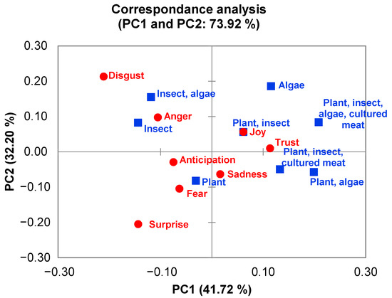 To obtain the visual relationship between emotions and the types of alternative proteins, the correspondence analysis test was conducted using the XLSTAT software (Version 2018.1.1.62926, Addinsoft Inc., New York, NY, USA) in Excel with a p < 0.05 threshold for statistical significance.
