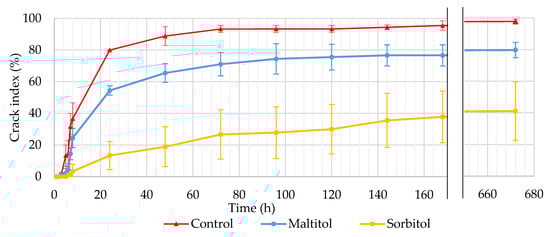 Cracks appeared quickly on the control biscuit, as early as 5 h after baking. Checking reached a significant rate (36.7%) at T0 + 8 h. After 24 h, 80% of the control biscuits showed cracks and from 72 h, the checking rate began to level off at around 93–96%. At 28 days, 97.8% of the biscuits were cracked and some were spontaneously broken. These results are consistent with checking rates obtained by Bedas et al. [17] on biscuits with a comparable recipe and process but slightly different thicknesses. Maltitol biscuits appeared to be less susceptible to cracking although checking kinetics are similar to that of control ones. At T0 + 24 h, 54.4% of the biscuits were cracked, and the crack rate stabilized at 74–76% between 4 and 7 days. The crack rate reached 79.7% at 28 days. Sorbitol biscuits were less prone to cracking. At T0 + 24 h, the crack rate was 13.3%. The crack rate gradually increased throughout the first 7 days to reach 37.8%. There was no real plateau, unlike the other two formulations. However, at 28 days, the crack rate had increased only slightly (41.1%). The variability of the sorbitol recipe was higher than that of the other formulations. The polyol recipes were less subject to checking than the control, but in different proportions. This difference in behaviour was noticeable over the first hours, even before the biscuit started to equilibrate with its environment. To our knowledge, this particular effect of polyols has not been shown before on cereal products.