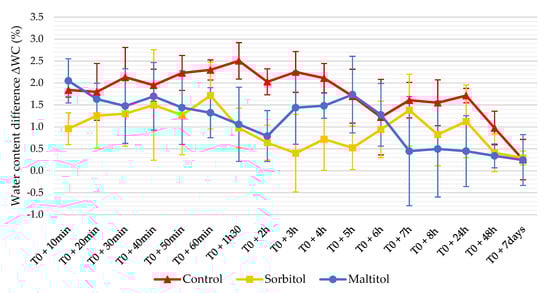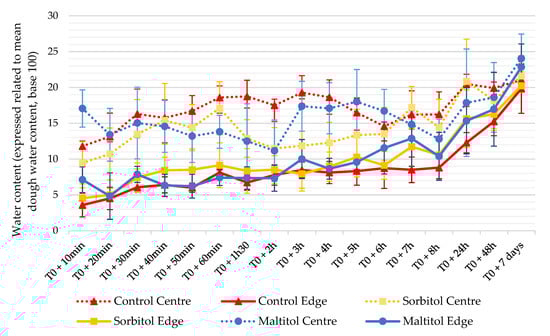 Figure 3 shows the evolution of water content difference (ΔWC) between the centre and the edge. Control biscuits have the highest ΔWC over the first few hours with values between 1.8% and 2.5% (d.b.). After 5 h, their ΔWC decreases and stabilizes around 1.5% before dropping below the threshold of 1% at 48 h. Maltitol biscuits exhibited a lower ΔWC between 0.7% and 2% up to 6 h after baking when it falls below 1.5%. Sorbitol had the lowest ΔWC with values systematically at the 1.5% threshold or at the limit. A gradual increase of water content in the biscuit periphery was observed over 8 h following baking for all recipes. This kinetics is the most obvious for the sorbitol biscuits. Next, a general water uptake of the biscuit was observed. This intake of water from the environment happens in the centre and, to a greater extent, at the edges of biscuits. Bedas et al. [17] obtained comparable results on a similar control recipe with biscuits of different geometry or thickness. At 7 days, the water gradient had almost vanished (ΔWC = 0.25) and was identical between formulations. However, one might consider that biscuits are in equilibrium from 24 to 48 h after baking with a gradient close to 1%. Conversely, the biscuits did not seem in balance with their environment since their overall water content continued to increase until the end of the experiment.