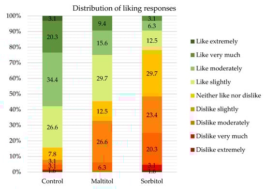 The control showed a mean hedonic rating of 6.6/9 (Table 6). As illustrated by Figure 4, most panelists (>80%) liked it and less than 8% disliked it. Maltitol showed a fair liking score of 5.5/9. Although it was less appreciated than the control, slightly more than half of the panelists liked it while about a third disliked it. The control and maltitol were, therefore, rather appreciated. Sorbitol was the least accepted product with a score of 4.6/9, which is just below average. So, this formulation can hardly be qualified as appreciated. Sugar substitution by the two polyols significantly decreased biscuit liking. This effect was more pronounced for sorbitol.