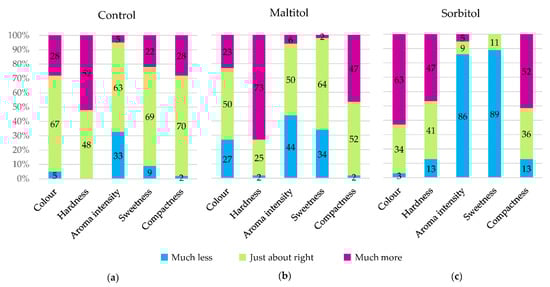 The theoretical sweetening powers of maltitol and sorbitol are 0.9 and 0.5 compared to sucrose (sweetening power = 1) [8]. Control and maltitol biscuits were perceived as JAR for most panelists. The control is fairly balanced between not enough and too sweet, while maltitol is considered not enough by a higher proportion of panelists due to its slightly lower sweetening power. A large majority of panelists, on the other hand, considered sorbitol insufficiently sweet. This result was logically expected as the loss of sweetness was not compensated by other means in the product. In the work of Zoulias et al. [11], a trained panel also rated the sweetness in maltitol and sorbitol biscuits, respectively, as slightly lower and much lower compared to the control. Sorbitol biscuits were also perceived to be less aromatic, while no difference was observed between maltitol and sucrose.
