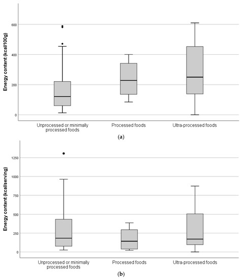 Energy density (kcal/100 g) was significantly higher for ultra-processed foods when compared to unprocessed/minimally processed foods, which was in line with what was found in other settings [35,36]. Although this difference was expected, it was not observed when we compared energy content per serving. These results might be directly explained by the variations on the portion sizes sold. Furthermore, some beverages are classified as ultra-processed, namely alcoholic beverages and soft drinks, which may also contribute to lower the mean energy value per serving of the whole food group. Furthermore, beverages and solid foods do not act as interchangeable items since they are usually consumed together and for that reason their nutritional content should not be compared. Foods included in the unprocessed/minimally processed food group were mostly main courses, which usually presented large serving sizes. On the contrary, ultra-processed foods were most commonly individually packaged, which helps to explain the smaller portions. However, fast food dishes (which are ultra-processed foods, but usually consumed as main courses) showed higher values of energy per serving than most homemade dishes.