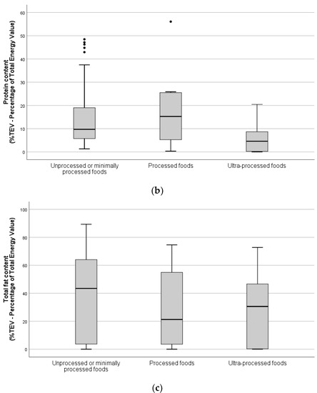 Comparison of energy content and macronutrient distribution of the three food groups according to degree of processing are presented in Figure 1 and Figure 2, respectively. Energy density of unprocessed or minimally processed foods was significantly lower than processed foods (156 vs. 237 kcal/100 g, p = 0.044) and ultra-processed foods (156 vs. 281 kcal/100 g, p = 0.003). No significant differences were found regarding energy content per serving. The contribution of protein to TEV in ultra-processed foods was significantly lower than in processed foods (6.8% vs. 14.3%, p = 0.041) and unprocessed/minimally processed foods (6.8% vs. 18.6%, p = 0.001). No significant differences regarding carbohydrates and fats were observed.