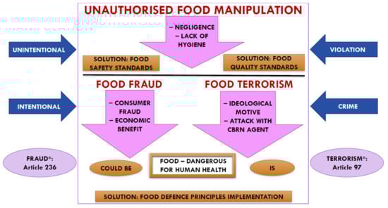 Food business operators (FBOs) have a legal obligation to comply with food hygiene requirements, and to establish and maintain traceability and quality (of food for human and animal consumption, as well as ingredients used in food) at all stages of production, processing, and distribution. They are also responsible for developing a reliable food supply system, with the ultimate goal of providing consumers with a safe food product. The implementation and certification of basic food safety standards (HACCP, ISO 22000), as well as extended standards (FSSC 22000, IFS, BRC) at FBOs, makes this possible. Therefore, the food safety approach should protect the food supply chain from unintentional contamination, while food defence protects the food supply chain from intentional adulteration that can cause harm [2], as well as from unauthorized food manipulation (UFM) (Figure 1).