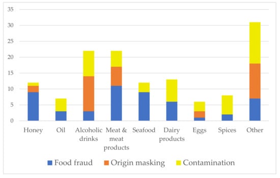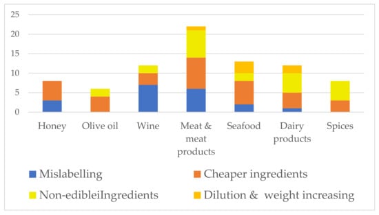 Responsibility for food adulteration and other food crimes lies with FBOs and the governmental administration [19,20], and internal quality control systems as well as legal monitoring systems are relied upon. In research conducted in Croatia and Serbia, the three main groups of food fraud types were mislabelling (35.8%), adulteration (18.9%), and substitution (13.2%) [19].