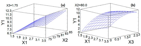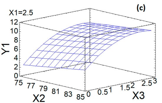Response surface of output parameters with different effects of experimental conditions: (a)—Influence of factors X1 and X2 on Y1; (b)—Influence of factors X1 and X3 on Y1; (c)—Influence of factors X2 and X3 on Y1.