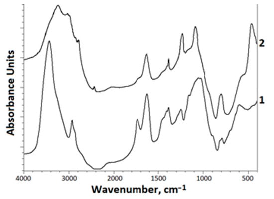 FTIR-spectra: 1—initial xanthan, 2—sulfated xanthan.