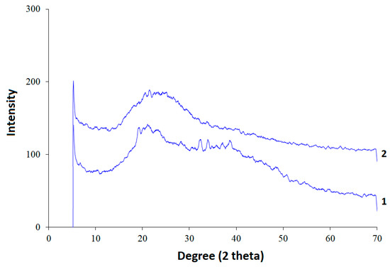 XRD data: 1—initial xanthan, 2—sulfated xanthan.