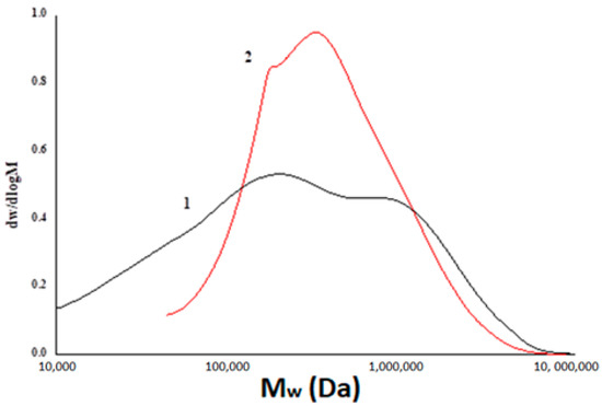 Molecular weight distribution of xanthan (1) and sulfated xanthan (2) samples.