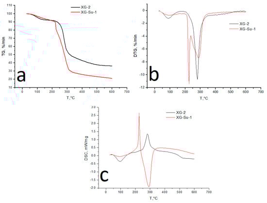 For sulfated xanthan, the initial stage of heating (up to 180 °C) is characterized by a less intense weight loss (−7.7%), compared to the original xanthan. The endothermic effect on the DSC curve of the indicated interval is flatter and not as pronounced.