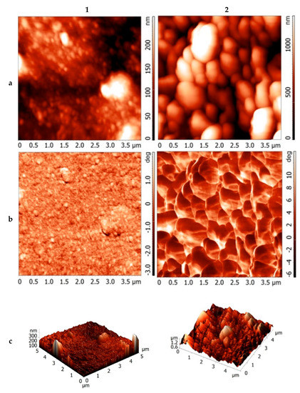 According to Figure 9, the surface of the xanthan film consists of near-spherical particles with an average size of 79.6 nm. Sulfation of xanthan leads to an increase in spherical particles to an average size of 281.9 nm as a result of agglomeration and aggregation. It was previously reported that the aggregation of a polysaccharide can be increased by introducing functional groups (for example, sulfate groups) that increase its inter and intramolecular interactions or polyelectrolyte effects [60,61,62]. Thus, the results obtained in our work correspond to the literary sources.