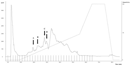 The fR-UF was fractionated by RP-FPLC; then, fractions were freeze-dried, resuspended in 1 mL of sterilized water, and assayed for assessing the ACE-inhibitory activity. Four of the thirty fractions (Figure 1) showed ACE-inhibitory activity, corresponding to 68.11 (fraction A), 54.49 (fraction B), 35.05 (fraction C), and 36.55% (fraction D) (Figure 1).