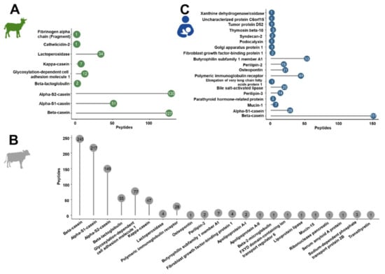 Among the peptides identified in this study, 36 were common between the cow and goat milk peptidomes, i.e., four peptides derived from αS1-casein, 13 peptides from αS2-casein peptides, 15 peptides from β-casein, and four peptides from lactoperoxidase. Only peptide LPIIQKLEPQIA of perilipin-2 was shared between the peptidomes of cow and human milk. No peptides overlapped among all three species.