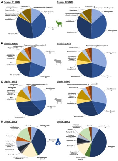 Number of peptides identified for each source protein in the individual brands of (A) goat (Powder G1 and G2), (B) cow milk-based powdered IF (Powder 1, Powder 2) and (C) cow milk-based liquid IF ( Liquid 1, Liquid 2) as well as in (D) human milk (Donor 1 and Donor 2).