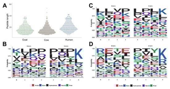 The peptides identified in this study reflect the native peptidomes present in the samples prior to digestion within an infant’s stomach. In all three sample types, the shortest peptides identified by our analytical strategy were seven residues long, while the longest peptides identified in cow, goat, and human samples were 53, 38, and 42 residues long (Figure 3A). The average peptide lengths were significantly longer in human milk with 21.2 residues than in cow (15.8) and goat milk-based IF (17.1). In order to evaluate the composition of endogenous peptides, the four N-terminal and the four C-terminal residues of alle peptide sequences were plotted using the sequence logo package within R [] (Figure 3B–D). In goat milk-based IF, the N-terminal sequence was dominated by Lys, Thr, Val, Ala, and Tyr counting together for a probability of 0.5 with the N-terminus often followed by a hydrophobic amino acid, such as Leu, Val or Ile (Figure 3B left). Lys appeared to be the main amino acid at the C-terminus followed by Leu and Arg (Figure 3B right). In cow milk-based IF, Leu, Lys, Ser, Val and Ile were more common at the N-terminus, while Lys and Leu were most frequent at the C-terminus, followed by Phe, Gln and Arg (Figure 3C). In human milk Arg, Ser, Ala and Asp were enriched at the N-terminus, whereas the C-terminal residues were typically Lys and Arg (Figure 3D).