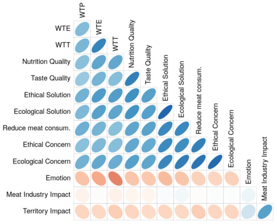 To better understand the positive drivers, motives, and barriers of consumer acceptance of “cell-based meat”, a correlation matrix was performed with all the quantitative variables described above.