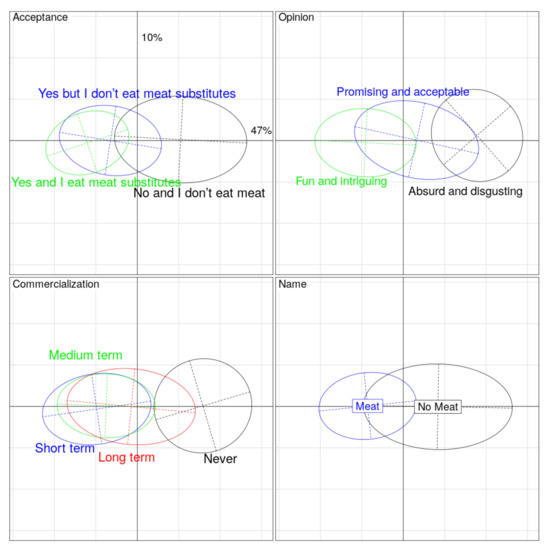 Principal component analyses showing the relationships between variables. In each graph are shown the first axis (horizontal, which explains 47% of the variance) and the second one (vertical, which explains 10% of the variance). We show the confidence ellipses for four qualitative variables: “Acceptance”, “Opinion”, “Commercialization/Marketing”, and “Name”.