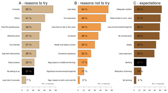 All these elements of interpretation are confirmed by two other questions of the survey. Overall, although 78.5% of respondents agreed to try “cell-based meat” at least once (but 21.5% had no willingness to try it), to the question “Why would you be willing to try cell-based meat?”, curiosity (55.3%) and ethics (40.7%) are presented as the most important reasons to engage with “cell-based meat”. The food crisis, attractive price, environmental reasons, and attraction to high-tech discoveries are presented as the second most important reasons (21.9–33.5%) associated with willingness to try this novel product. Prevention of zoonosis is not the main concern (7.2%) of the respondents (Figure 5A).