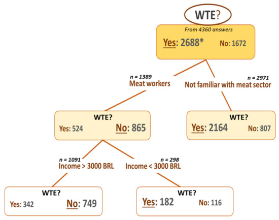 Respondents who eat meat regularly with the lowest income (<1500 BRL) have the highest WTE (0.86). Regardless of meat consumption habits, respondents with higher income (>7500 BRL) have the lowest WTE (<0.51) (Table 3).