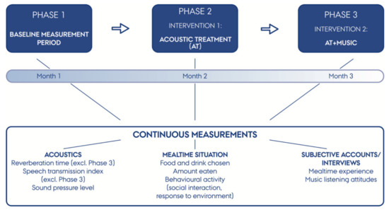 The project followed a novel methodological interventional framework, incorporating acoustical measurements, observational studies of patients during mealtime, and individual semi-structured interviews with patients and staff. The project was designed as a between-subjects design comparing effects between the three phases, in which each intervention phase builds upon the previous (see Figure 1).
