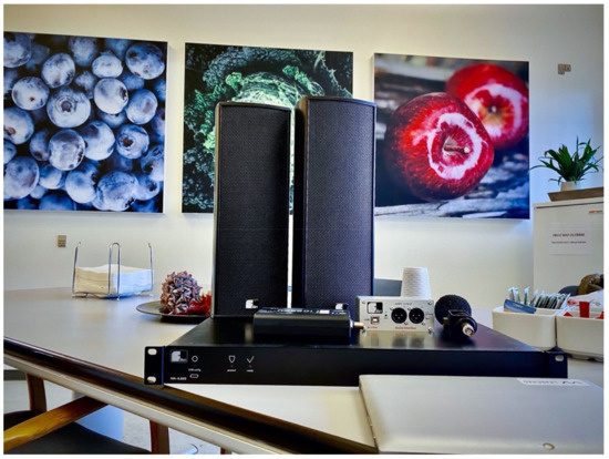 Five playlists of instrumental only pieces were compiled. The music was primarily chosen from a list of validated pieces developed in a Danish clinical music therapy project [76,78,79]. The final genres represented in the playlists were Classical, Easy Listening, Folk, Jazz, and MusiCure [80], reflecting a broad range of styles and genres. The sequence of the five playlists to be played on individual days during Phase 3 was decided randomly with no playlists being played on consecutive days (see Figure 2 for audio equipment description). Music was played from the Apple Music application using the built-in feature “Sound Check”, which automatically adjusts playback volume to the same level on all tracks in the Apple Music Lossless audio codec.