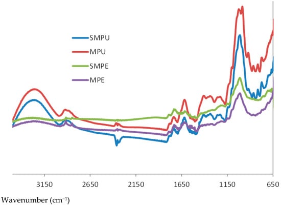 FTIR spectra for umbu peels and pulps. MPE: mature peel; SMPE: semi-mature peel; MPU: mature pulp; SMPU: semi-mature pulp.
