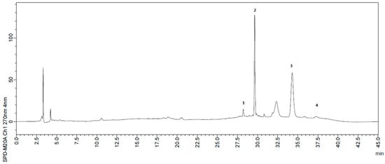 Typical chromatogram for phenolics: 1. p-coumaric acid; 2. ellagic acid; 3. Quercetin; 4. procyanidin b2.