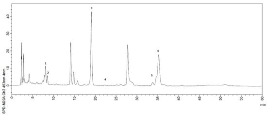 Typical chromatogram for carotenoids: 1. Lutein; 2. Zeaxanthin; 3. beta-cryptoxanthin; 4. alfa-tocopherol; 5. alfa-carotene; 6. beta-carotene.