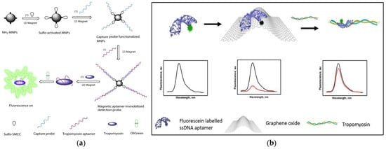 (a) Schematic of preparation of magnetic-assisted fluorescent aptamer for tropomyosin detection. Reproduced with permission from [154]. Copyright Sensors and Actuators B-Chemical, 2018. (b) Schematic of graphene oxide-based fluorescent aptamer biosensor for TM detection A: Changes in the fluorescence intensity of the aptamer released from the GO surface; B: The linear correlation of the fluorescence intensity of TMT2 (at 515 nm) with the concentration of TM. Reproduced with permission from [156]. Copyright Food Chemistry, 2020.