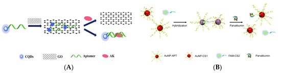 Fluorescence resonance energy transfer (FRET) is a mechanism widely used in the preparation of biosensors, which is an energy transfer phenomenon between two fluorescent molecules that are very close [157]. Zhou et al. designed an aptamer-based “on-off-on” fluorescent biosensor based on FRET and used developed carboxyl functionalized carbon quantum dots (cCQDs) and GO for the detection of shellfish allergen arginine kinase (AK) (Figure 3A) [158]. The cCQDs-aptamer probe and GO self-assemble for the first time through a specific π-π interaction, so that the fluorescence of cCQDs is effectively quenched. After the addition of AK, cCQDs-aptamer is released from the GO surface and then forms the cCQDs-aptamers-AK complex, which restores the fluorescence of cCQDs. The aptamer-based FRET sensor can perform sensitive detection in the AK concentration range of 0.001–10 μg mL−1, with a LOD of 0.14 ng mL−1 (S/N = 3) and a limit of quantification (LOQ) of 0.27 ng mL−1 (S/N = 10). Furthermore, in a control experiment with a blank sample, it was found that the sensor has high specificity. This reliable, precise, highly specific, and easy-to-operate aptamer sensor may provide a new perspective for the application of fluorescence sensing technology in the field of food safety.