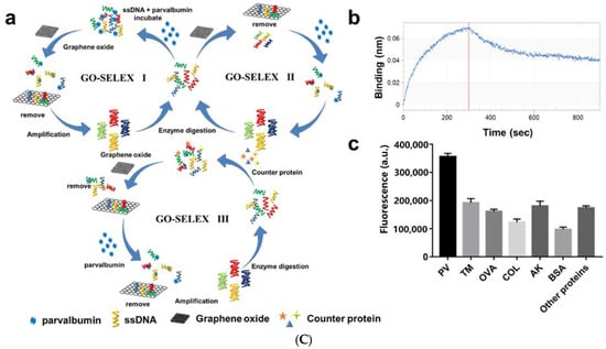 In recent years, biosensors based on dual signals or functions have received widespread attention due to the diversity of detection. Dual-mode nanosensors usually use colorimetric and fluorescent reporters to achieve convenient visual inspection and highly sensitive fluorescent detection [160,161]. Wang et al. developed a dual-mode aptamer-based fluorescent sensor for the detection of PV, the major allergen of fish (Figure 3B) [159]. In Figure 3C(a), aptamer towards PV was obtained by in vitro screening of random ssDNA library containing a 40-mer randomized region using the triple-mode GO-SELEX. The aptamer-modified gold nanoparticle (AuNP-APT), complementary short-strand modified gold nanoparticles (AuNP-CS1), and fluorescent dye-labeled complementary short-strands (FAM-CS2) were assembled by DNA hybridization. After the addition of PV, the competitive interaction with aptamer leads to the decomposition of the aptamer sensor, resulting in the color shift of the AuNPs solution and the recovery of the FAM-CS2 fluorescence signal. The results showed that the aptamer sensor showed a good colorimetric response (2.5–20 μg mL−1) and linear fluorescence correlation (2.38–40 μg mL−1) in the PV concentration range. In addition, the affinity and specificity of the aptamer sensor were also investigated, as shown in Figure 3C(b,c). Therefore, aptamer 5 with good affinity (KD = 7.66 × 10−7 M) and specificity is the best aptamer for aptasensor construction. They also studied the feasibility of aptamer sensor in real fish samples, revealing the potential in field of monitoring and quantitative detection of food allergens.