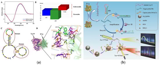 (a) Schematic of Lg-18 and β-lactoglobulin binding. A: Circular dichroism analysis of Lg-18 before and after binding. B: Analysis of thermodynamic parameters in the combined process. C: Secondary structure of Lg-18 predicted by Mfold online software. D: Analysis of molecular docking results of aptamer Lg-18 and β-lactoglobulin (b) Schematic of aptamer-based fluorescent Raman dual-mode biosensor for detection of β-lactoglobulin. Reproduced with permission from [166]. Copyright Sensors and Actuators B-Chemical, 2021.
