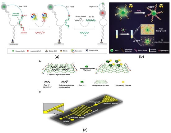 Lys, as an allergen in egg and a biomarker of many diseases, its detection and quantification are of great significance in clinical diagnosis [167]. Sapkota et al. developed an aptamer sensor based on single-molecule FRET (smFRET) for the detection of Lys (Figure 5a) [168]. One of the arms has a blocking chain (B1), which is extended by 15 nucleotides to partially hybridize to the aptamer. The aptamer sensor remains open and almost no FRET efficiency occurs when Lys is not detected. After the addition of Lys, the aptamer binds to Lys and is displaced from the sensor, resulting in a foothold-mediated replacement of B1 by another chain, H1. At this time, the binding of Lys triggers the conformational transition state from low FRET to high FRET. Using this strategy, they demonstrated that the aptamer sensor can detect Lys at concentration as low as 30 nM, with a dynamic range extends to ~2 μM, and is almost free of interference from similar biomolecules. In addition, the smFRET method requires only a small number of aptamers, which offers the advantage of cost-effectiveness. In fluorescence detection, the presence of background fluorescence induced by ultraviolet-visible light in biological samples can lead to inaccurate detection results [169]. However, Ou et al. developed an X-ray nanocrystal scintillator aptamer sensor for sensitive detection of Lys based on the characteristics of weak scattering and almost no absorption of biological chromophores under X-ray irradiation (Figure 5b) [170]. In this study, aptamer-labeled lanthanide-doped nanocrystalline scintillators are designed to detect Lys quickly and sensitively through FRET. The use of low-dose X-rays as the excitation source and nanocrystals containing heavy atoms can achieve efficient luminescence, which endows the aptamer fluorescence sensor with high sensitivity (LOD: 0.94 nM), specificity, and sample recovery. In addition, this technology can provide a new generation of high-efficiency strategy without autofluorescence interference for the sensing and detection of biomarkers in biomedical applications.