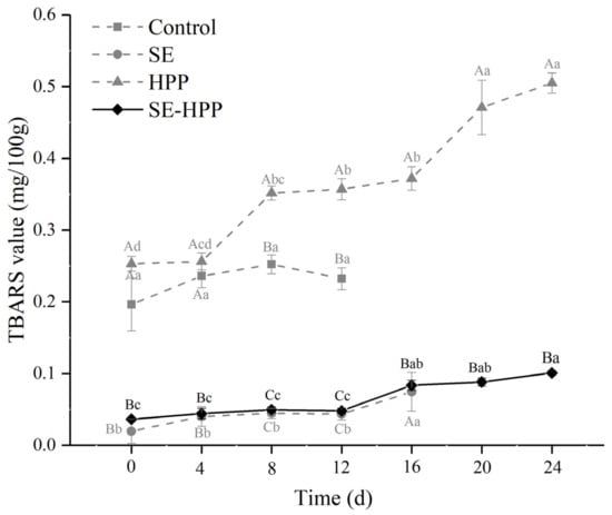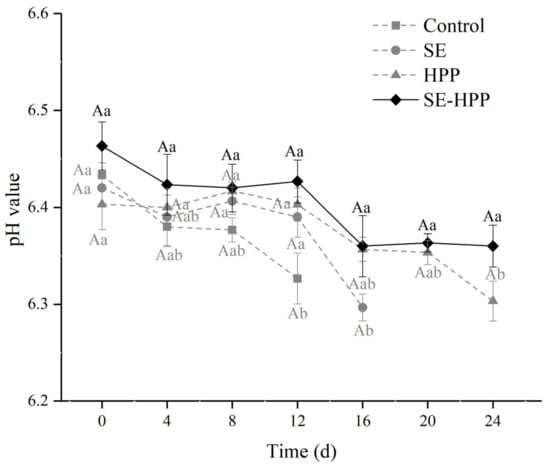 The pH value is an important parameter in monitoring meat quality. There was no significant change in the pH value of all the samples during the first 8 d (Figure 1). At 12 d, the pH value of the control group was significantly lower compared with the beginning of storage (p < 0.05), which may be attributed to the organic acid accumulation produced by spoilage microorganisms [35]. It was noticed that among the three groups, the pH value of SE group was the lowest at 16 d. Researchers have shown that HPP can inhibit the growth of spoilage and pathogenic bacteria in various meat products [36]. At 24 d, the pH value of the HPP group showed a significant decrease compared with the storage initial stage (p < 0.05). Meanwhile, the pH value of the SE-HPP group was close from 0 d to 24 d, indicating the possible existence of a synergistic antimicrobial effect of the spice extracts and HPP treatment.