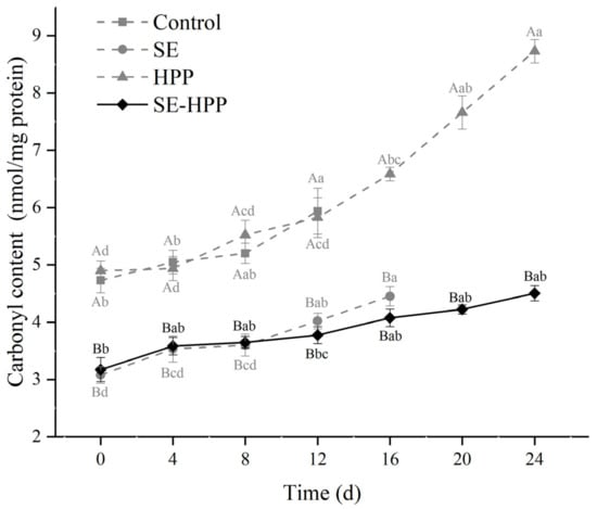 As shown in Figure 3, the carbonyl contents of all the groups increased gradually during storage. The HPP-treated samples had the highest carbonyl content of up to 7.89 nmol/mg during the storage (p < 0.05). The carbonyl contents in the SE and SE-HPP groups were significantly less than those of the control and HPP groups throughout the whole storage (p < 0.05). This indicated that the SE and SE-HPP treatment can effectively retard the protein oxidation, which was consistent with the results of lipid oxidation in these samples, as described in Section 3.3. Furthermore, there was no significant difference between the SE and SE-HPP groups during storage (p > 0.05).